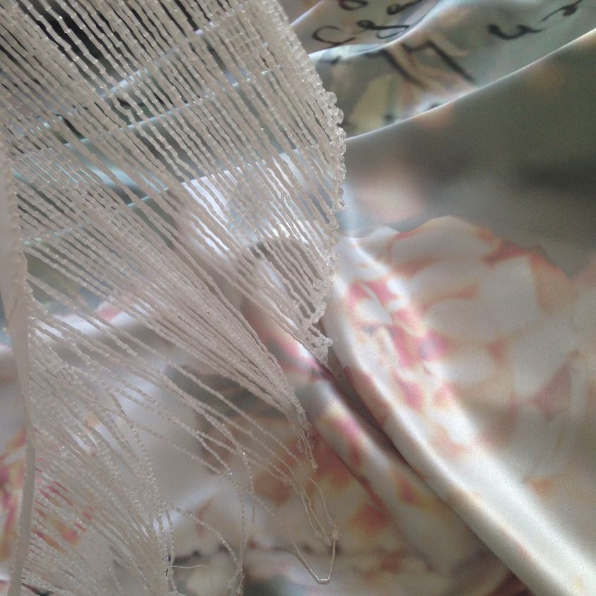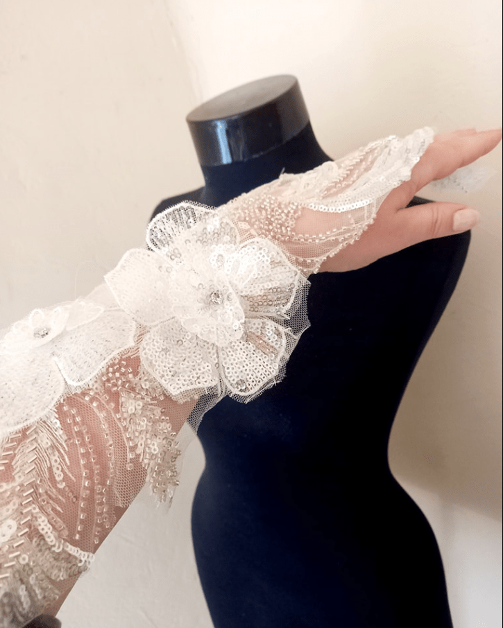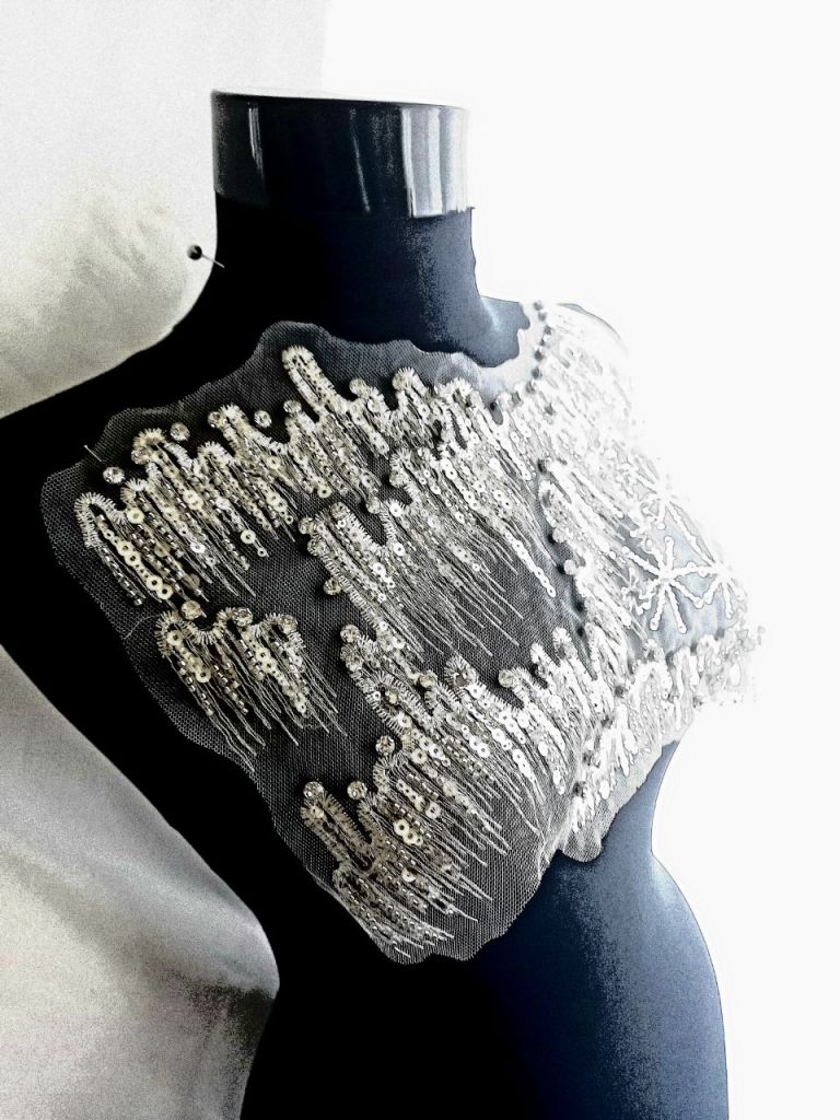 cu perle, margele si paiete pe argintiu,baza tull off white.